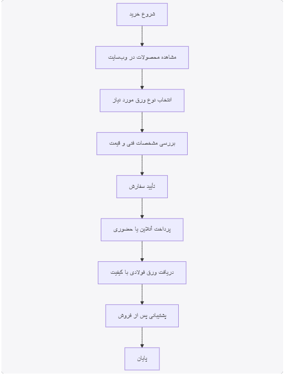 این نمودار جریان فرایند خرید به شما کمک میکند تا مراحل خرید ورق فولادی از آرسیس فولاد آسمان را به طور خلاصه مشاهده کنید.